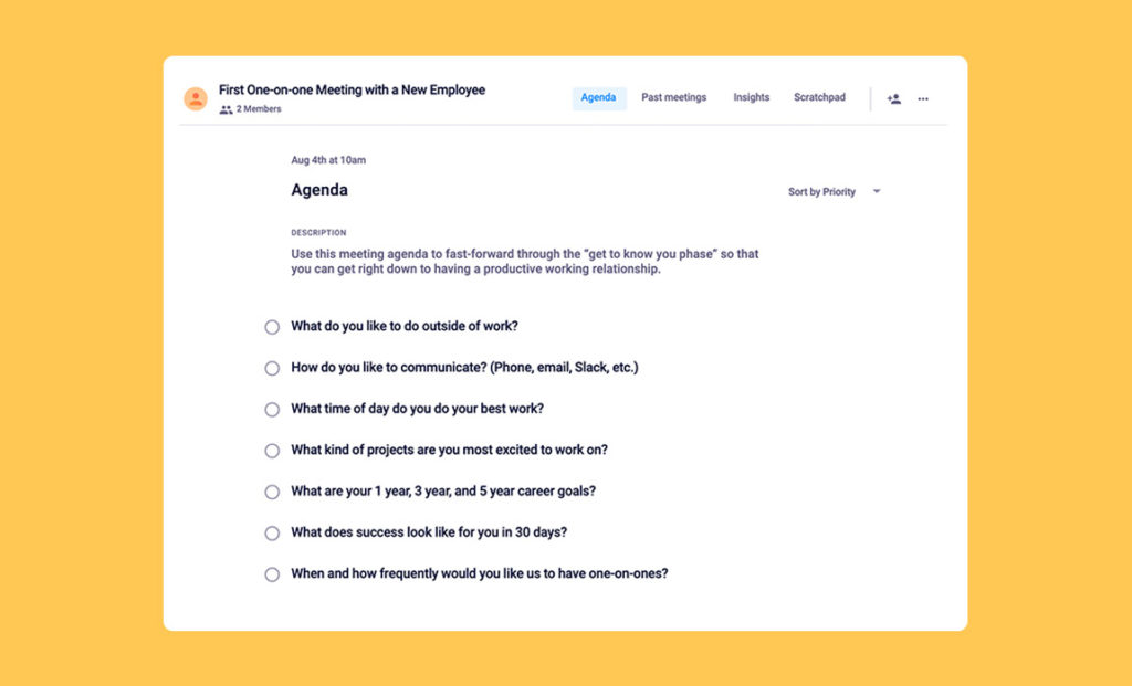 Peer-to-peer one-on-ones are intended to connect two individuals (cross-functionally or within the same department) who don’t report to one another. The goal of this meeting is to open up channels for feedback and collaboration, outside of an individual’s direct team or from a top-down direction. Cross-funcitonal peer to peer meetings are also a powerful way to break down silos and open up communication channels. For this meeting to be truly effective, add these 4 items to your agenda: